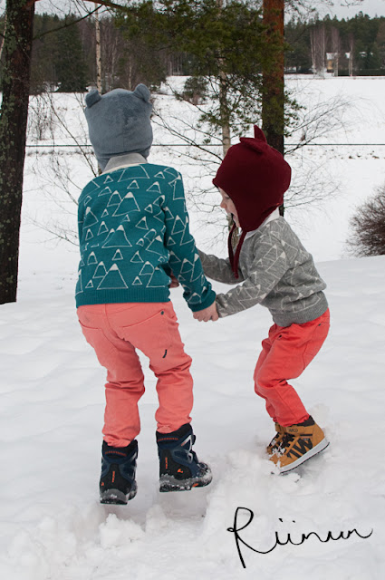 Poikien villapaidat ompelin Ottobren Mr Bear trikoopaidan kaavalla, jota väljensin vähän. Isompi on koossa 122 ja pienempi koossa 98. Pääntielle laitoin tavallisen resorin, koska se ei kutita. Hihansuissa ja helmassa on joustoneuletta, joka tehtiin samasta langasta kankaan alkuun neulomisvaiheessa.
