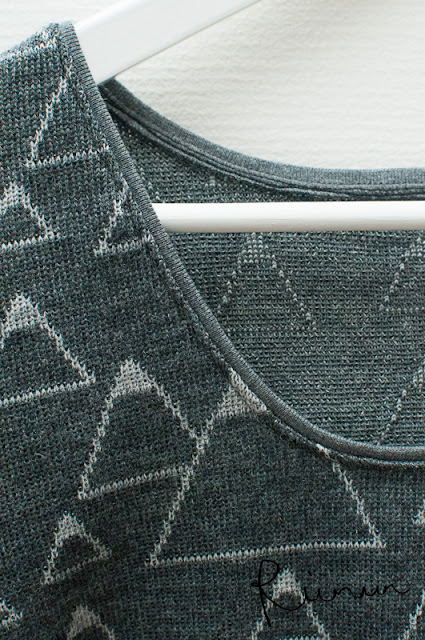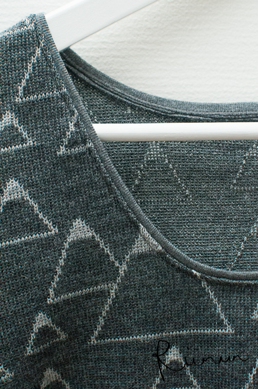 Itselleni tein villamekon omalla kaavalla. Kaavan piirtäminen vaati moni vaiheita ja sovituskappaleita, mutta onnistui kuitenkin varsin hyvin. Nyt minulla on ainakin yksi ylhäältä edes melko hyvin istuva kaava! Villaneulos ei veny paljoa, mikä oli otettava huomioon kaavan mitoituksessa. Reunat kanttasin harmaalla resorilla samaan tyyliin kuin poikienkin paidat.