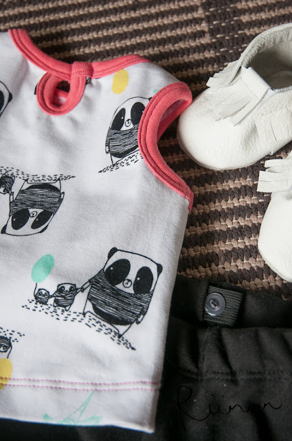 En tehtävään lupautuessani tiennyt, olenko tekemässä vaatetta tytölle vai pojalle vai kummalle tahansa. Jos olisin tiennyt etukäteen, olisin ehkä valinnut helpon tien ja valinnut listalta poikavauvan odottajan. Kaapissa on sattuneesta syystä enimmäkseen pojille sopivia kuoseja ja värejä. Tämä tulokas osoittautui kuitenkin tytöksi, joten tein pienen kesäsetin tytölle. Vaatteet näyttävän Ottobren tyyliin valtavan leveiltä, toivottavasti pieni ei ihan huku näihin!