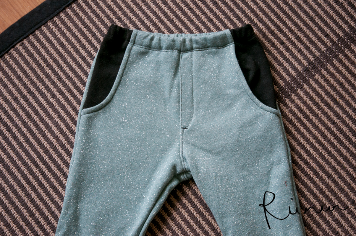 Housut menivät rikki toisella käyttökerralla. Niihin ilmestyi reikä reiden sisäreunalle laivareissun alussa. Se saa luultavasti kuitenkin paikattua melko huomaamattomasti. Mitään näyttävää paikkaa tai taskua sen päälle ei voi laittaa, koska reikä on niin hankalassa kohdassa. Kyllä taas on ollut ilo ommella lapsille… Paidan kangas on tullut Viljamin puodin yllätyspussista ties kuinka kauan sitten, housujen kangas on Kankaamosta ostettua glittercollegea, johon Vilho ihastui käydessämme Raision liikkeessä joskus huhtikuussa. Housuissa on myös yksi musta takatasku.