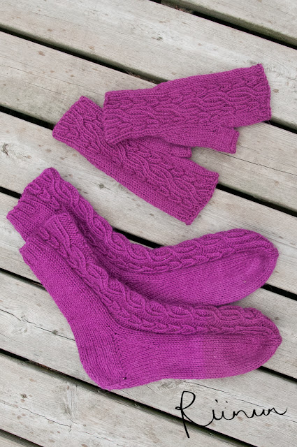 Aloin neuloa sukkia muistaakseni juhannuksen tienoilla – tai sitten ne valmistuivat silloin. En enää muista. Kynsikkäitä neuloin pidempään tai pikemminkin harvemmin, ja ne valmistuivat tällä viikolla. Ajattelin vielä ommella näihin mätsäävän pipon, ja jotain voisi neuloakin, kun lankaa jäi vielä jäljelle.