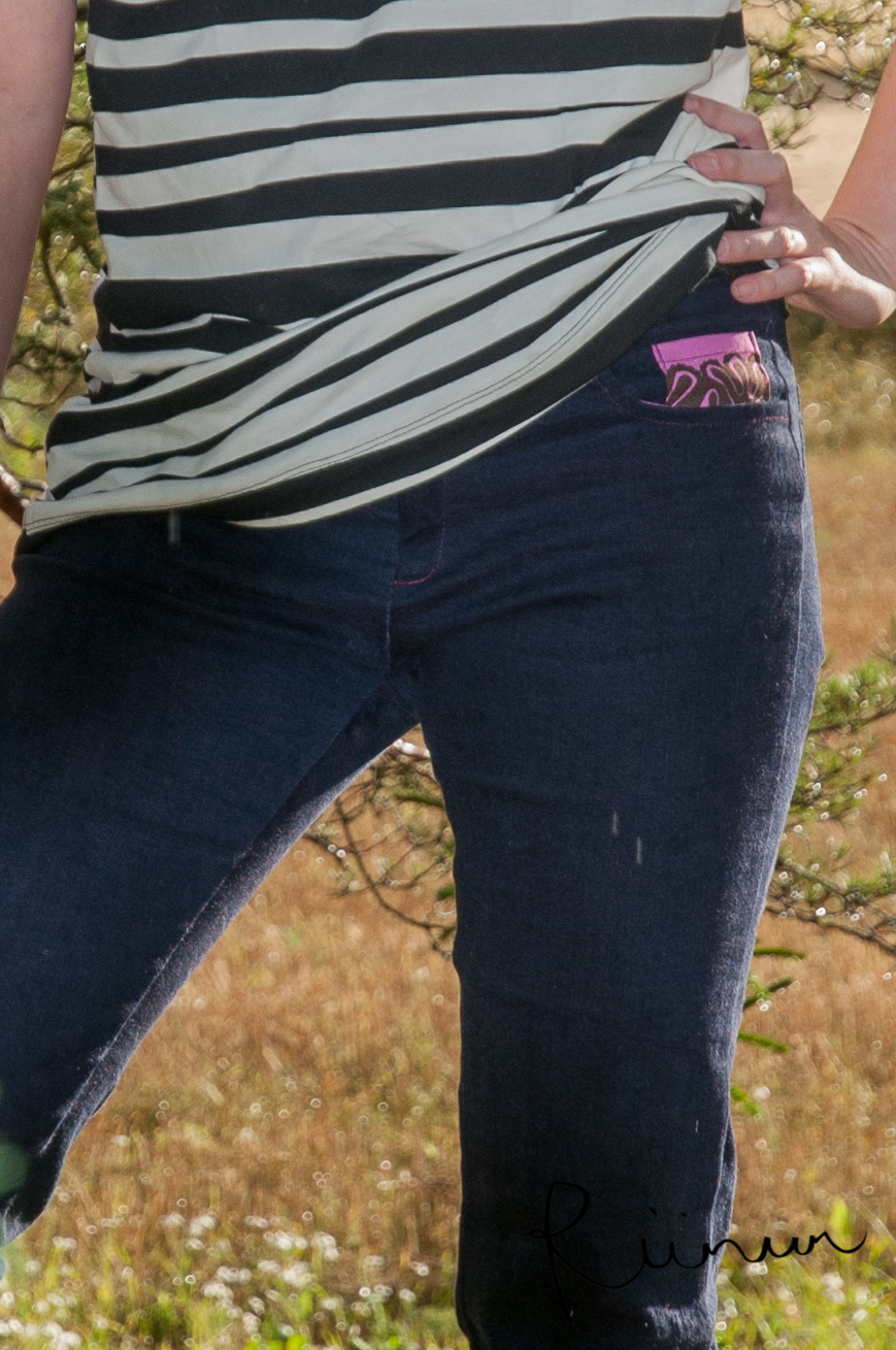 Nämä on ommeltu Eurokankaan todella joustavasta farkusta, joka on nurjalta puolelta vaaleanpunaista. Punainen kuultaakin farkusta hiukan läpi, joten tein tikkaukset luumunpunaisella langalla. Kolikkotasku on Marimekon puuvillaa, samoin taskupussi, joka ei tosin näy mihinkään.