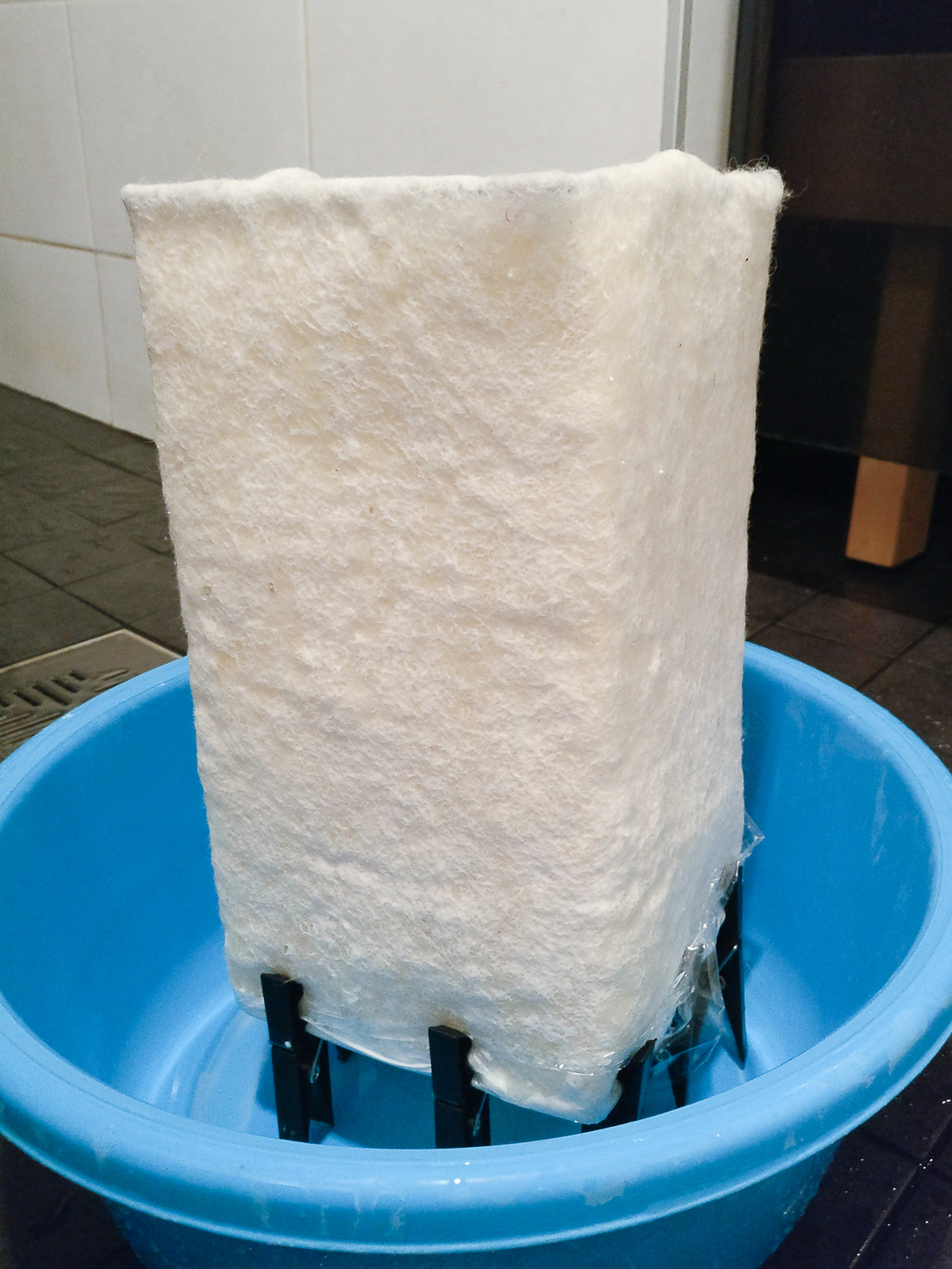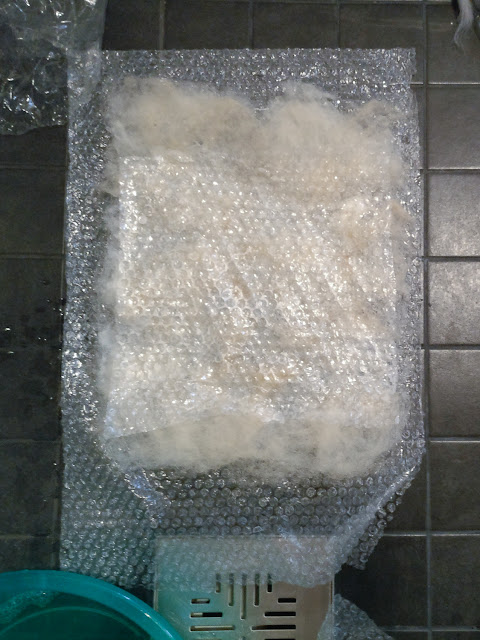 Villat asetetaan erittäin ohuina kerroksina ristikkäin ison kuplamuovilevyn päälle. Minulla villakerroksia on vain kolme. Villaa pitää olla 3-4 cm yli mallipalan reunojen. Tällöin huopalevyssä on vähän kutistumis- ja saumanvaraa. Saumanvaroja tarvitaan, kun huopalevy huovutetaan yhtenäiseksi ympyräksi ja kiinnitetään kehikkoon. Kuumaa mäntysuopavettä pirskotellaan villojen päälle, mutta saumanvarat saavat jäädä kuiviksi. Päälle asetetaan kuplamuovista leikattu mallipala (kuva alla) ja sen päältä aletaan kaulita villaa tavallisella kaulimella. Kuplamuovin epätasainen pinta tehostaa huopumista, ja ohuet villakerrokset pysyvät muovien välissä hyvin paikoillaan. Kun huopalevy pysyy koossa, huovuttamista jatketaan käsin Marseilles-saippuaa apuna käyttäen. Huopaa hierotaan varovasti käsin niin kauan, ettei siitä saa nypittyä enää irti villaa.