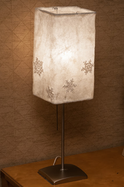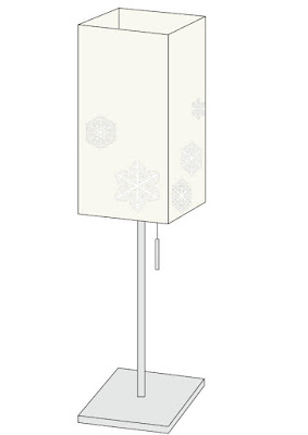 Varjostin koostuu yhdestä yhtenäisestä huopalevystä, joka on huovutettu ympyrän muotoon. Rakennekuvassa näkyy varjostimen mitat, joissa ei ole huomioitu saumanvaroja. Korkeudessa käänteisiin täytyy varata 1,5 cm ylös ja 1,5 cm alas, jolloin lopullinen korkeus on noin 32 cm. Leveydessä saumanvaraa tarvitaan kumpaankin päähän 1–1,5 cm. Varjostimen yhden sivun leveys on 15 cm. Koristeeksi varjostimeen kiinnitetään 6-8 ohuesta luonnonvalkoisesta pellavalangasta virkattua lumihiutaletta, joiden halkaisija on 3-10 cm. Jokainen lumihiutale on erilainen aivan kuten luonnossakin. Teemallisesti lumihiutaleet ovat kulkeneet mukanani jo pitkään eri muodoissa. Lumihiutaleissa minua kiehtoo niin uniikkius. Ne ovat kaikki äkkivilkaisulta samanlaisia, mutta lähempi tarkastelu paljastaa niiden jokaisen olevan erilainen ja erityinen