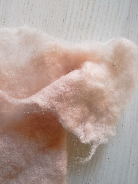 Ensimmäinen levyhuovutuskokeilu epäonnistui. Yritin tehdä huovutuksen alusta asti käsin, eikä tulos ollut sellainen kuin halusin (kts. ensimmäinen kuva alla). Huovutin kuplamuovin avulla vaaleanpunaisen huopalevyn (kts. toinen kuva alla), joka onnistui hyvin. Kokeilin myös virkattujen lumihiutaleiden tärkkäystä, sillä ajattelin, että ne olisi tärkkäyksen jälkeen helpompi kiinnittää varjostimeen. Tein tärkiksi vesi-sokeri-seoksen, jossa oli yksi osa vettä ja yksi osa sokeria. Lumihiutaleet kuitenkin värjäytyivät sokeritärkistä kellertäviksi ja muuttuivat paksuiksi ja rumiksi (kts. kolmas kuva alla). Jouduin liottamaan hiutaleet ja pesemään ne pesukoneessa, jotta sain suurimman osan tärkistä irti. Lopulta päädyin vain pingottamaan ne muotoonsa ilman tärkkiä.