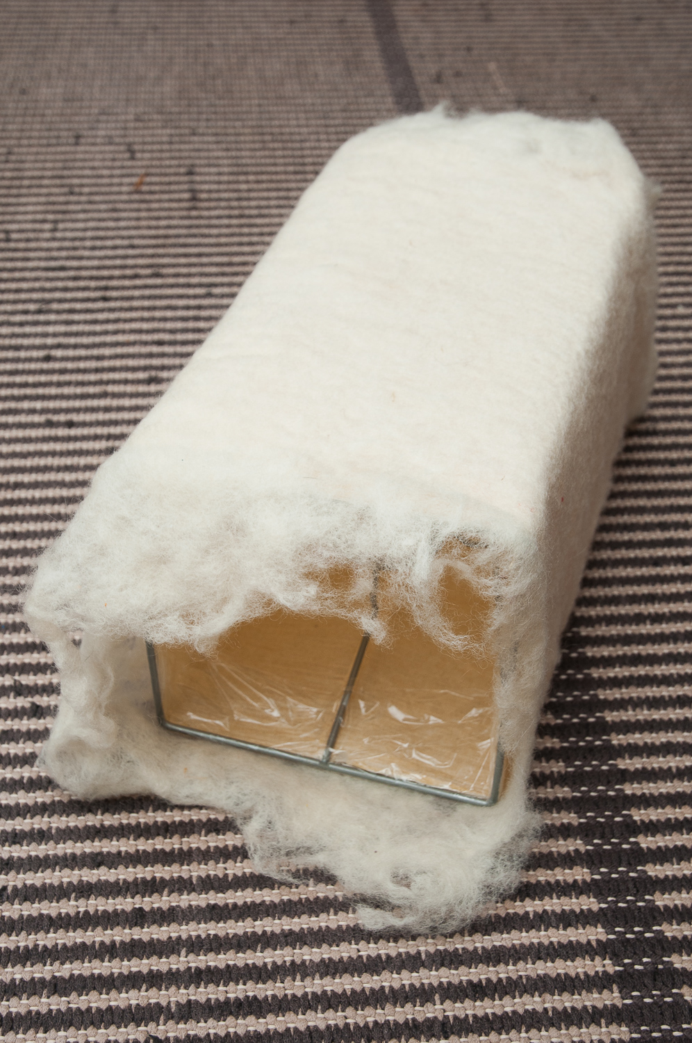 Kun huovutettu levy on valmis, se jätetään kuivumaan tasossa. Kuivana huopalevy sovitetan varjostimen kehikkoon (kuva alla) ja neulahuovutetaan yhtenäiseksi. Neulahuovutuksessa kannattaa leikata vaahtomuovista varjostimen sisäosan kokoinen pala ja tehdä huovutus sitä vasten. Näin varjostimesta tulee varmasti oikean kokoinen. Minulla oli varjostimen sisällä vanhasta vaahtomuovipatjasta leikattu pala.