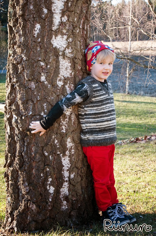 Lanka on siis Istexin Álafoss Lopia. Tein tästä joskus vuosia sitten villatakin miehelleni ja siitä jäi jäljelle neljää eriväristä lankaa epämääräiset kerät. Nyt niistä jämistä (ja yhdestä ekstrakerästä) tuli vielä neuleliivi noin koossa 110-116. Tämä on niin paksu, että se menee keväämmällä helposti välikausitakista 😀 Vilho sai vapaasti valita, miten halusi poseerata kameralle. Meidän puidenhalailija ❤
